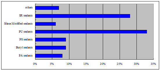 In China, the consumption proportion of sealants in its application areas are: 8% in PA sealants, 9% in Butyl sealants, 9% in PS sealants, 33% in PU sealants, 6%in Silane Modified sealants, 28%% in SR sealants, 7% in others.